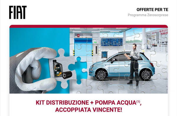 (1) L'offerta prevede l'utilizzo dei ricambi "Genuine Parts" per selezionati modelli di FIAT e per veicoli con anzianità superiore a 36 mesi. Offerta comprensiva di ricambi e manodopera e valida fino al 31/08/2022