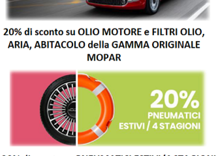 Gentile Cliente,dal 15 aprile è entrato in vigore l'obbligo di dotarsi di pneumatici estivi.Preparati al cambio stagione e metti in sicurezza il tuo veicolo Fiat.Fai controllare gratuitamente lo...